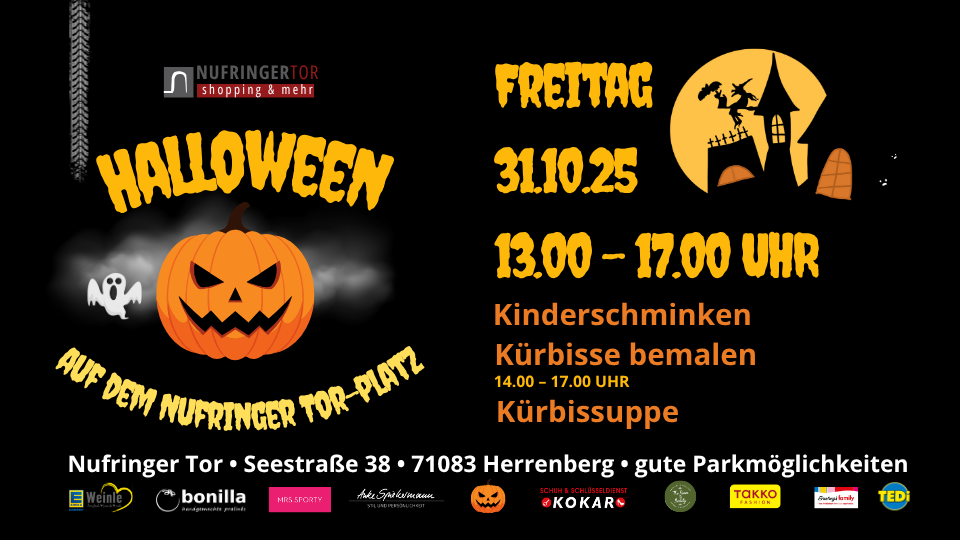Kommt vorbei, bringt gute Laune mit und feiert mit uns ein fröhlich-schauriges Halloween auf dem Nufringer Tor-Platz in Herrenberg!